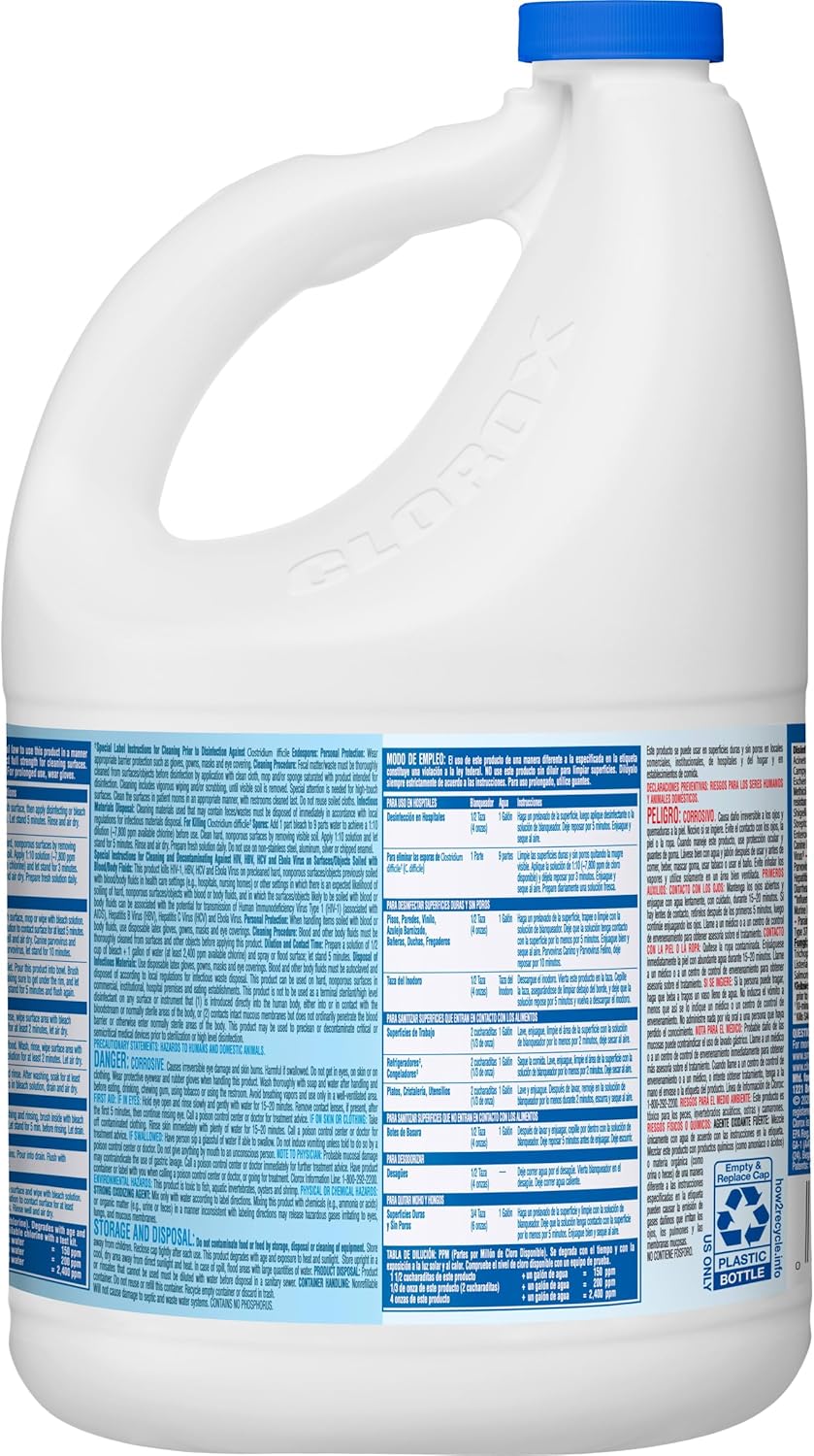 • BLEACH: Clorox Germicidal Bleach can be used for disinfecting, sanitizing, deodorizing, and removes mold and mildew on hard non-porous surfaces; Packaging may vary