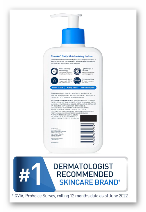 [ DAILY MOISTURIZING LOTION ] Smooth, light-weight texture that is absorbed quickly, leaving skin feeling smooth and hydrated, never greasy [ LONG-LASTING HYDRATION ] Contains Hyaluronic Acid to help retain skins natural moisture and MVE technology to provide 24 hour hydration [ GENTLE ON SKIN ] Holds National Eczema Association (NEA) Seal of Acceptance. Fragrance free, allergy-tested, non-comedogenic, and suitable for use as a body lotion, face moisturizing lotion, and/or hand lotion [ 3 ESSENTIAL CERAMIDES ] Ceramides are found naturally in the skin and make up 50% of the lipids in the skin barrier. All CeraVe products are formulated with three essential ceramides (1, 3, 6-II) to help restore and maintain the skin’s natural barrier [ DEVELOPED WITH DERMATOLOGISTS ] CeraVe Skincare is developed with dermatologists and has products suitable for dry skin, sensitive skin, oily skin, acne-prone, and more.