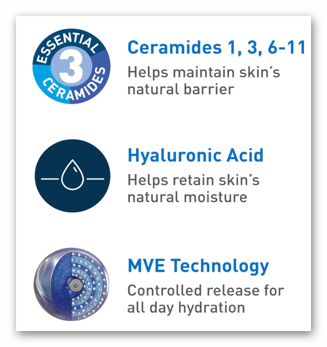 •MVE Technology: This patented delivery system continually releases moisturizing ingredients for 24-hour hydration